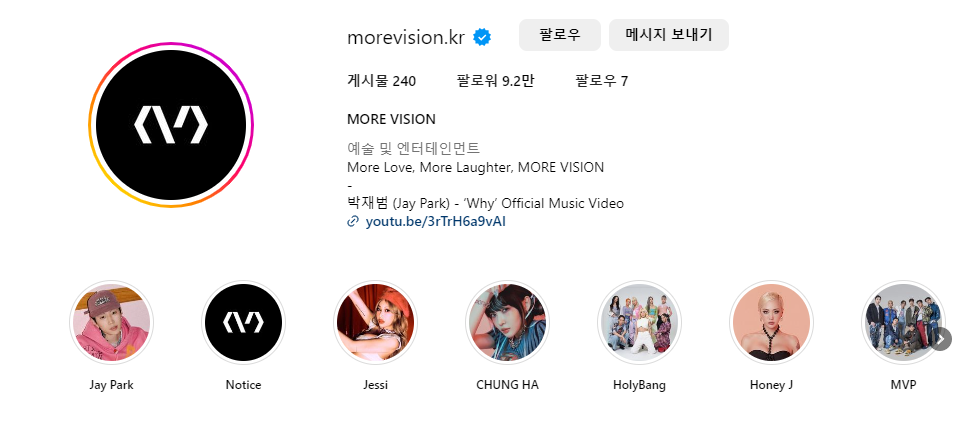 홈페이지 소개에 따르면 '모어비전은 AOMG, H1GHR MUSIC, WONSOJU 등 힙합, R&B 장르 문화 기반의 감각적인 브랜드를 전개해나갔던 박재범이 2022년 3월에 설립한 새로운 엔터테인먼트 허브입니다.'라고 한다~