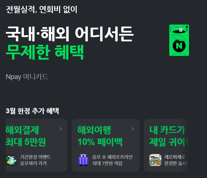 전월실적, 연회비 없이 '국내·해외 어디서든 무제한 혜택'을 내세우는 Npay 머니카드에 대해 알아보겠다.